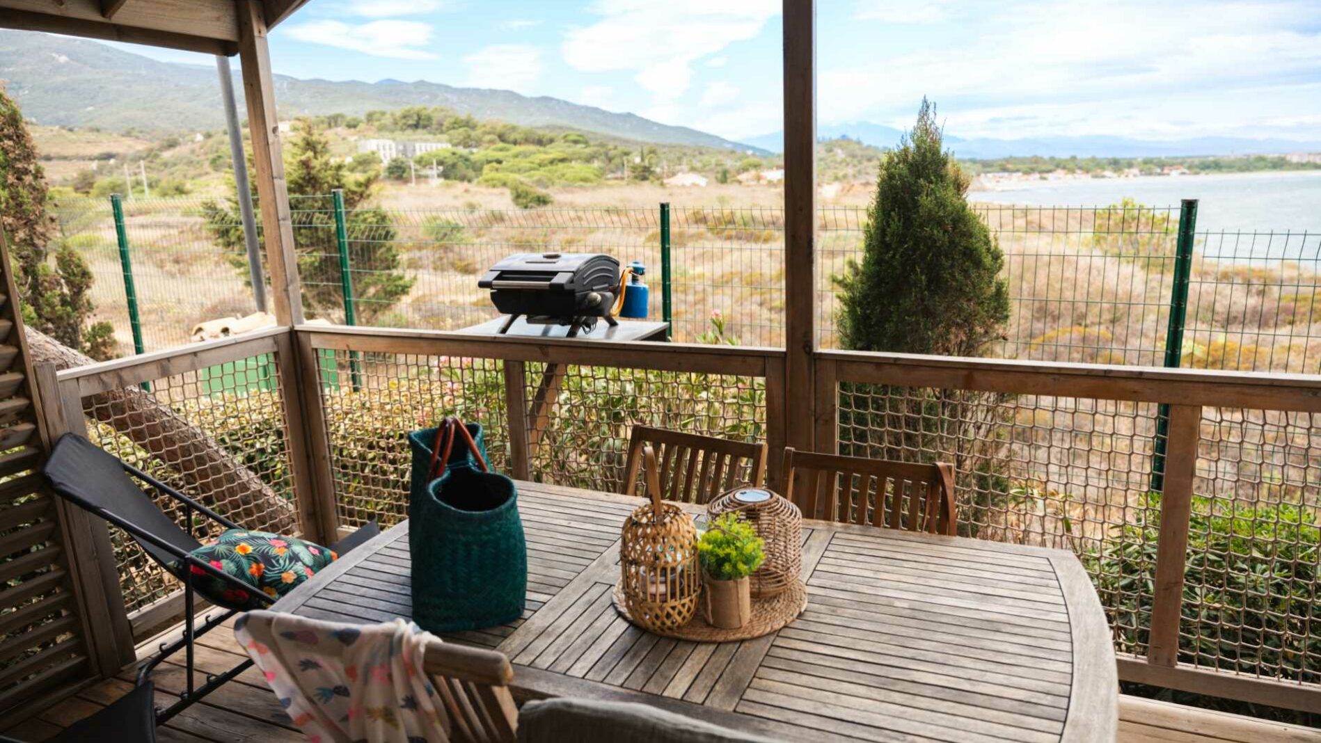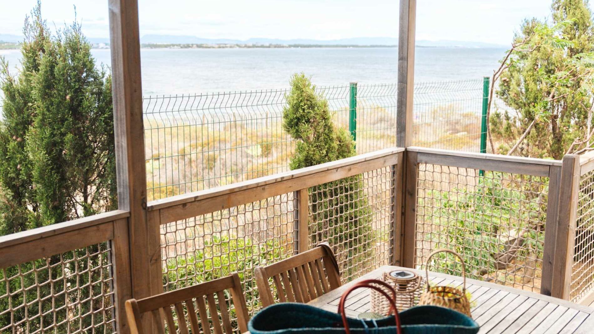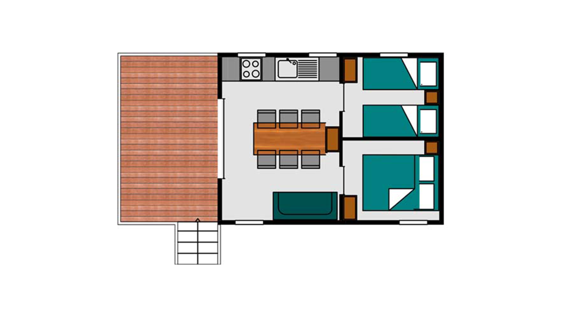 24 m² + 10 m² Of covered terrace. One bedroom with 1 double bed (140×190), one bedroom with 2 single beds (80×190), one sofa bed for 2 people (140×190). A fully equipped kitchen. Wooden garden furniture.