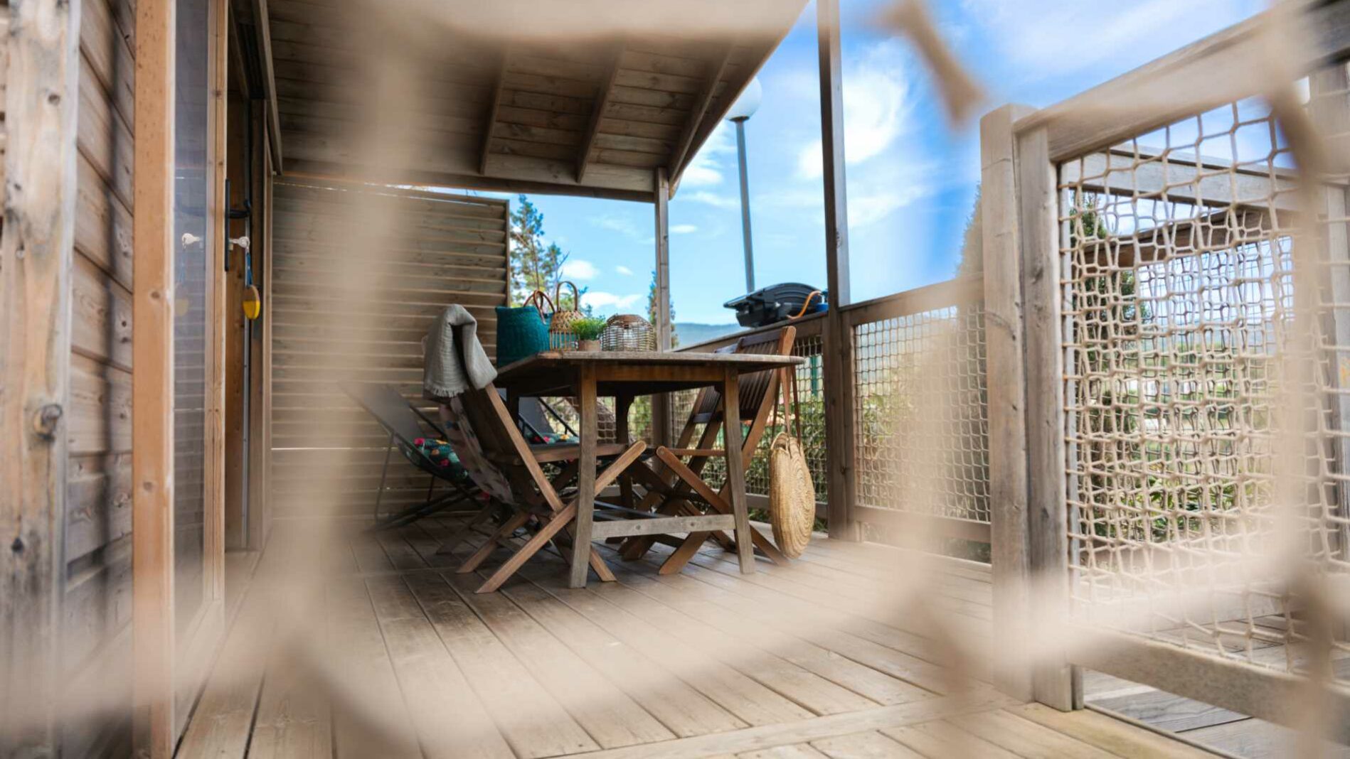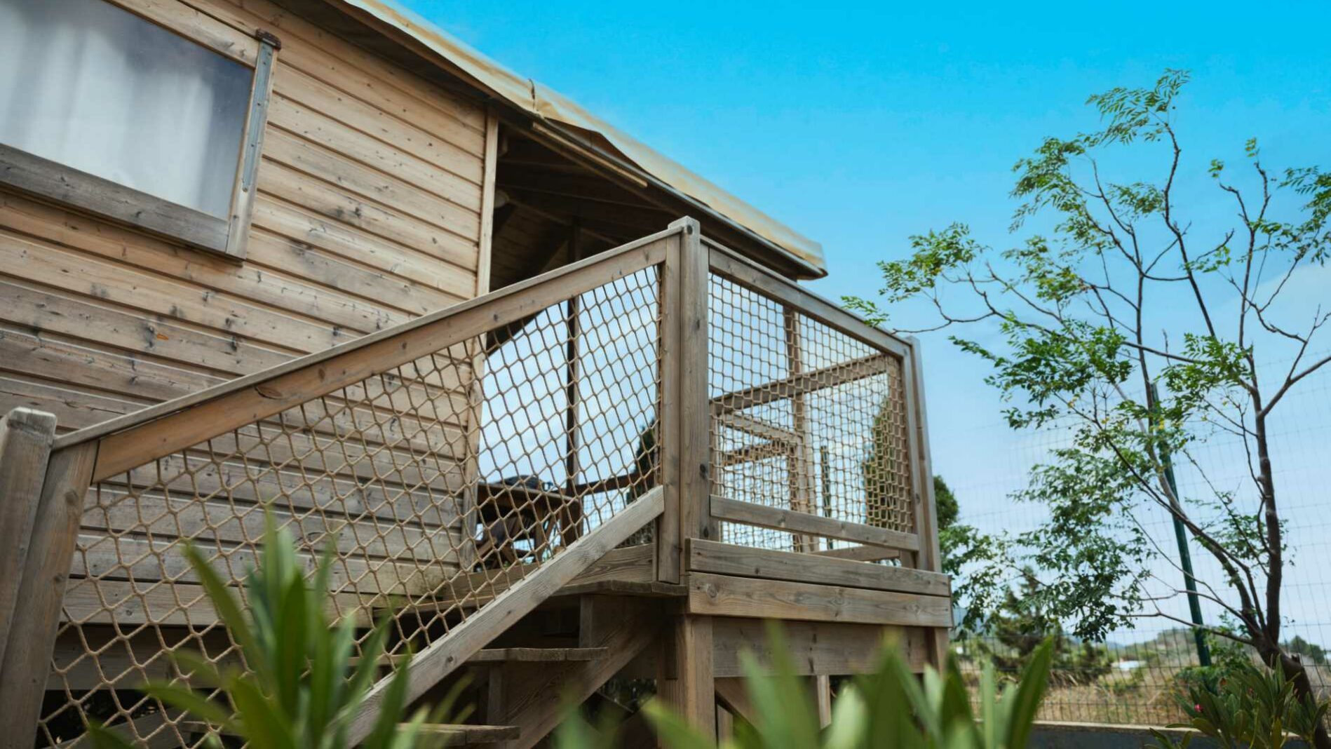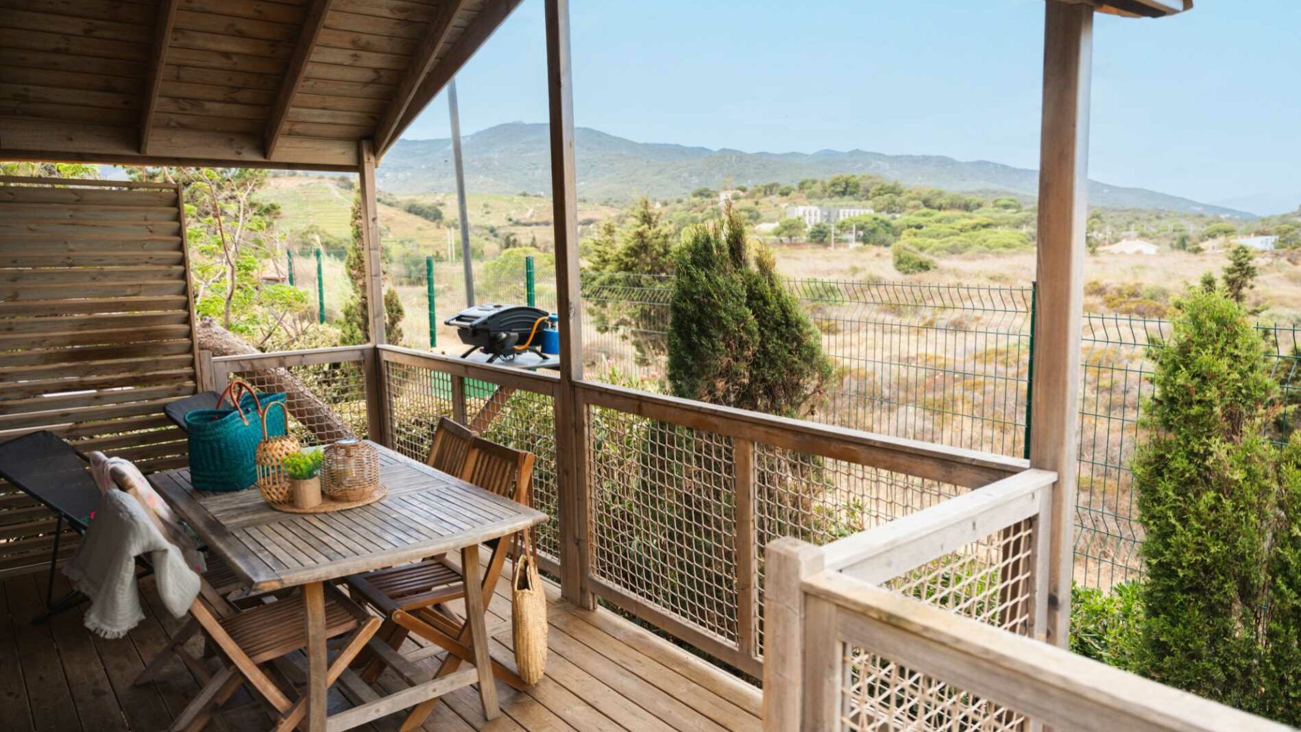 24 m² + 10 m² Of covered terrace. One bedroom with 1 double bed (140×190), one bedroom with 2 single beds (80×190), one sofa bed for 2 people (140×190). A fully equipped kitchen. Wooden garden furniture.