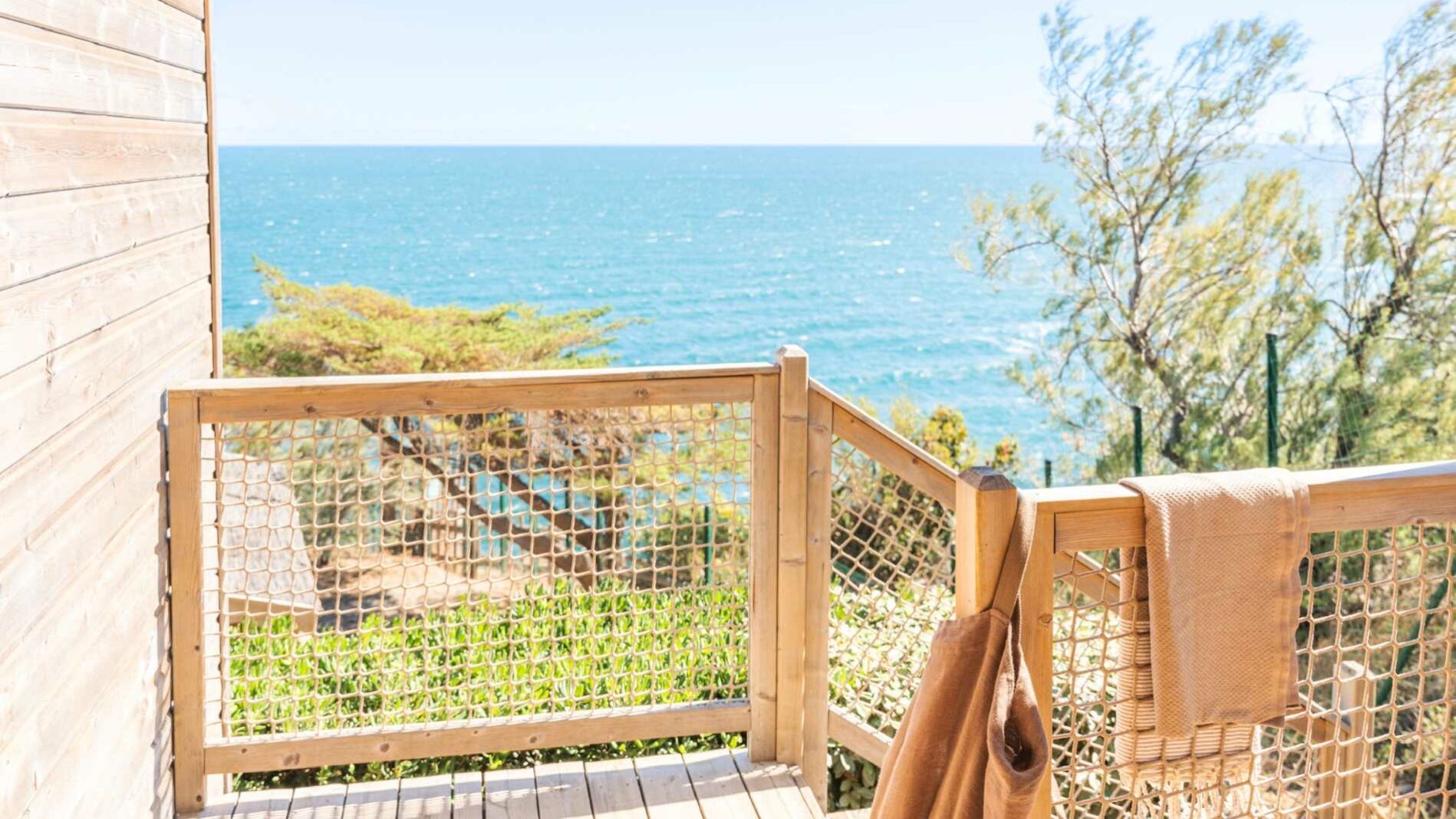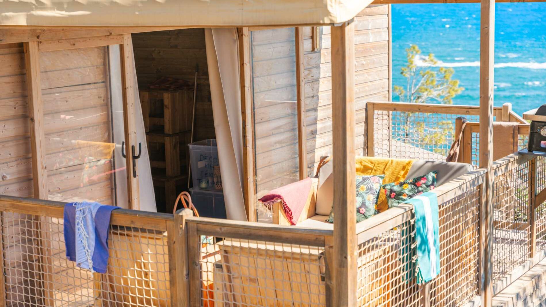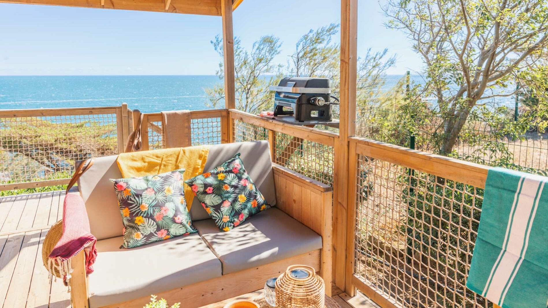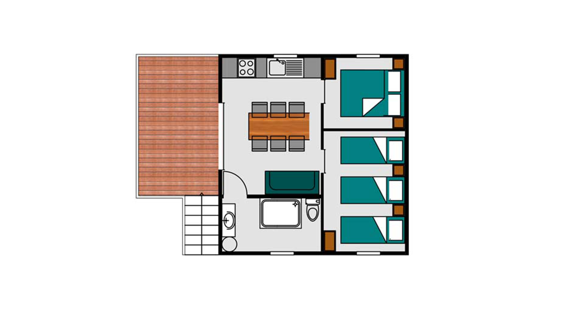 32 m² + 10 m² Of covered terrace. One bedroom with 1 double bed (140×190), one bedroom with 3 single beds (80×190), a sofa bed for 2 people (140×190). A fully equipped kitchen. A bathroom with sink, shower and toilet. Wooden garden furniture.