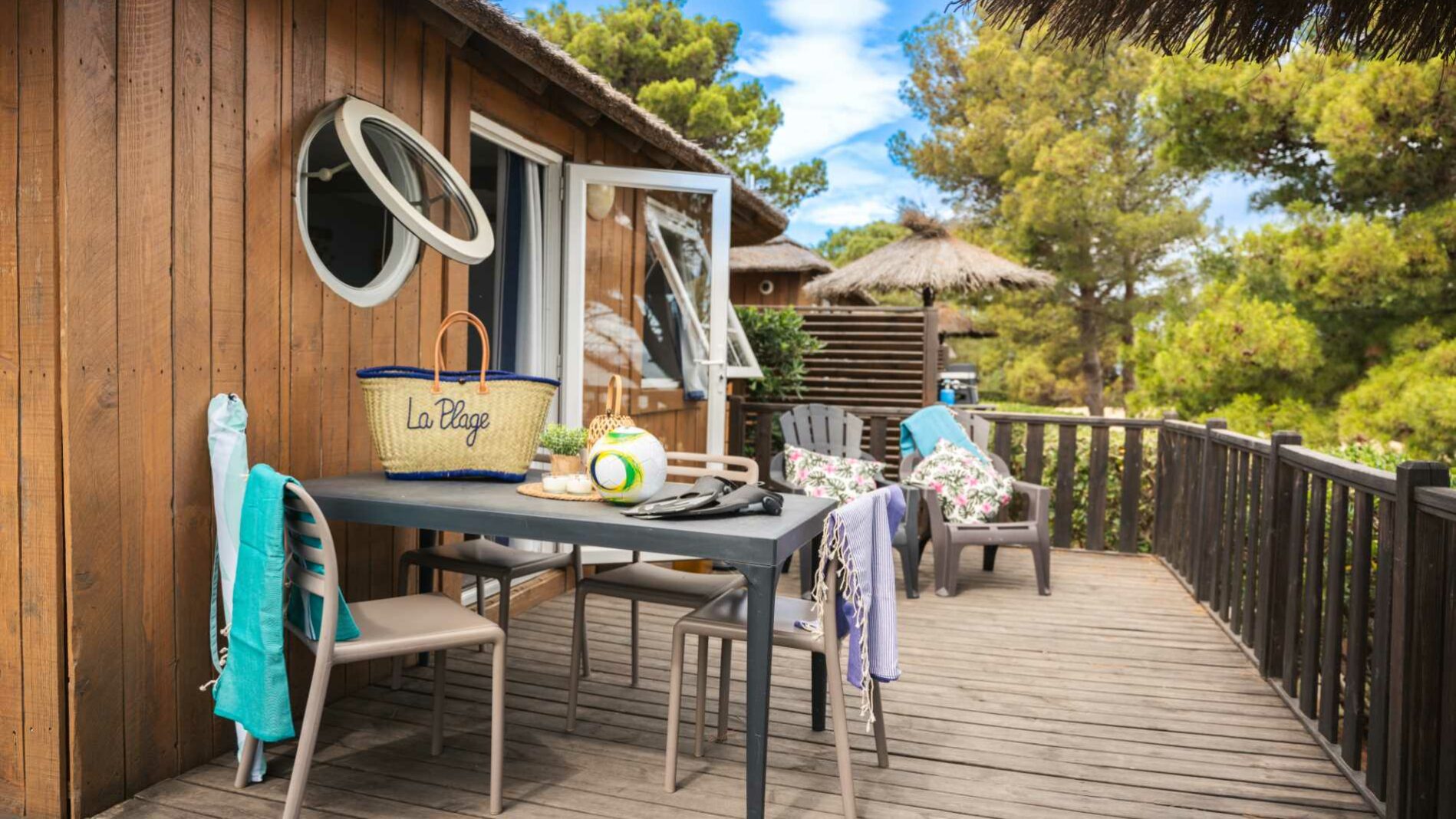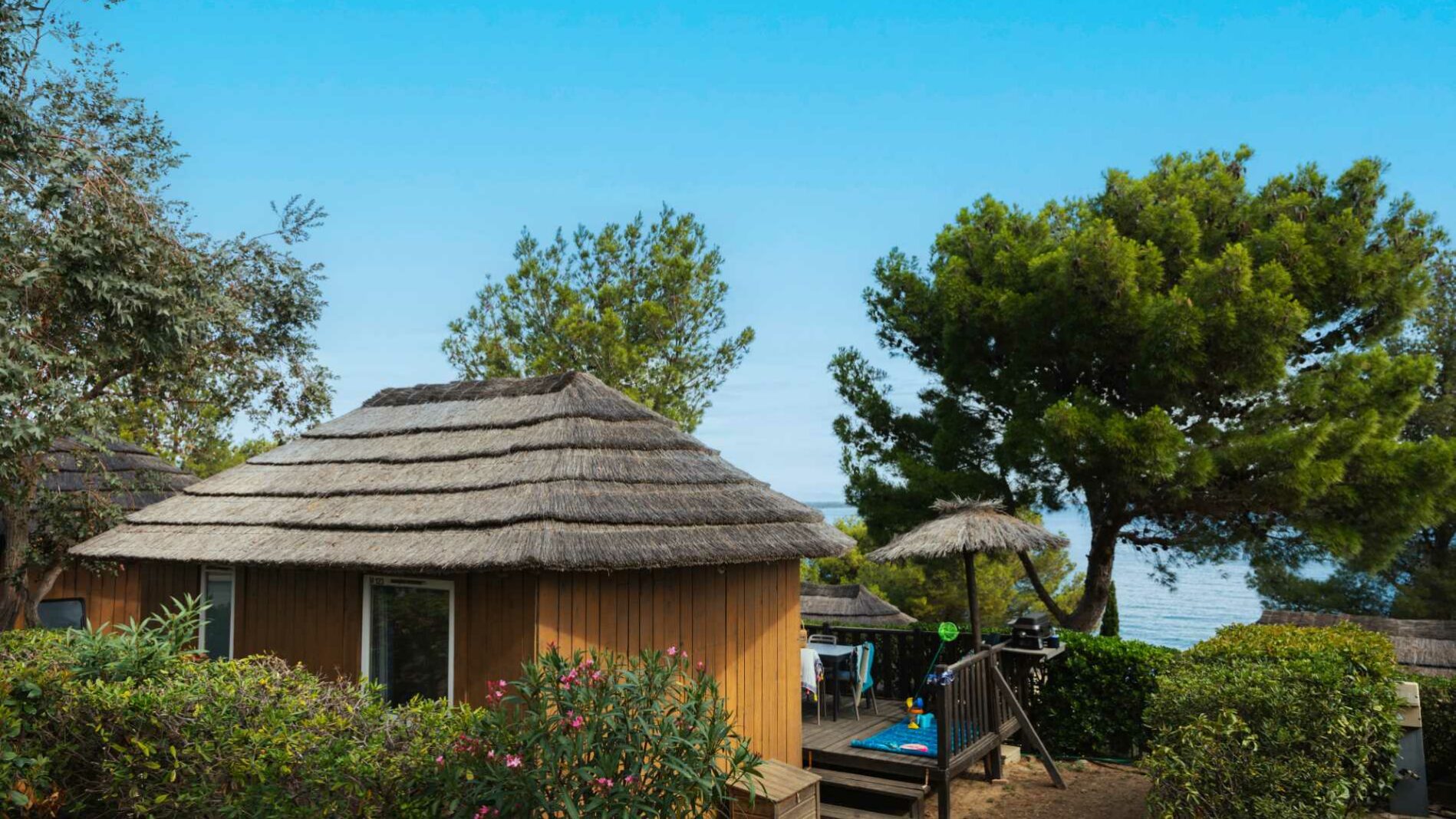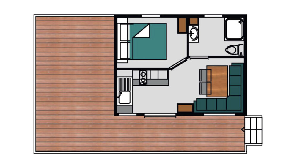 The comfort like a mobile-home restyled in a cottage from 20m². One bedroom with a double bed (160 x 200). A dining area convertible into bed for 2 people (140 x 190), a fully equipped kitchen, 1 bathroom with shower, toilet and sink. A wooden terrace varying from 15m² to 22m² with a garden set and a fixed parasol.