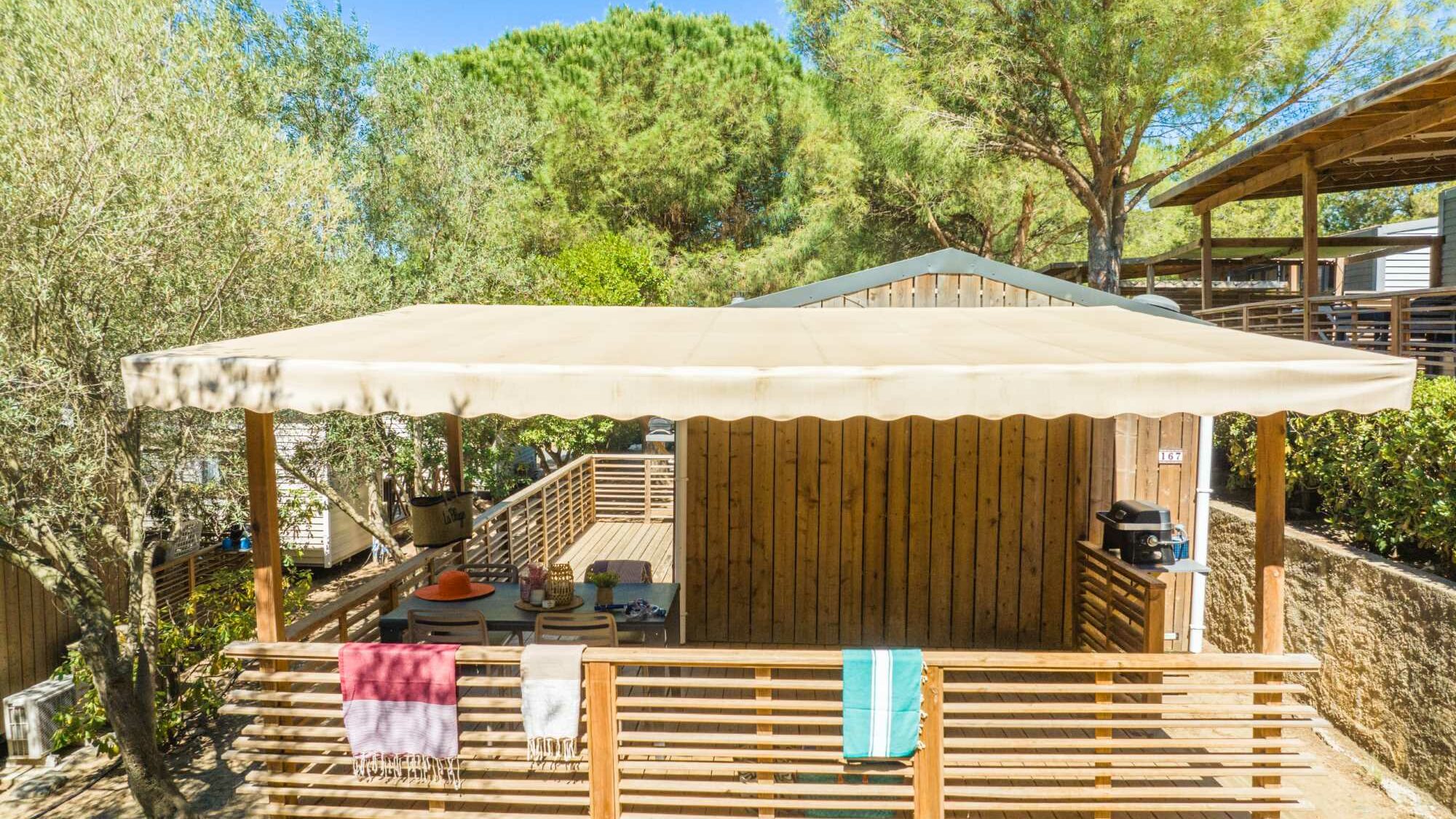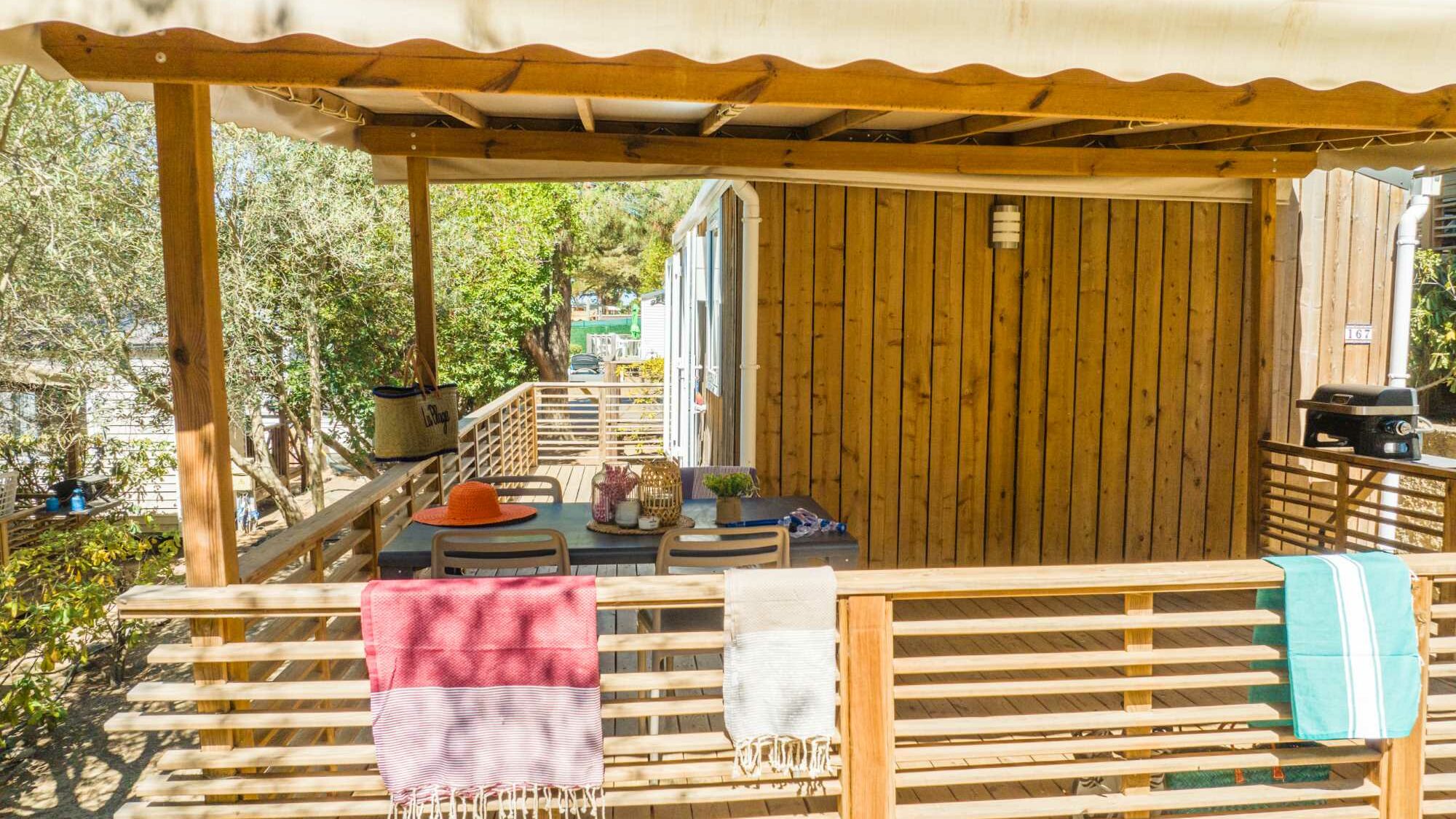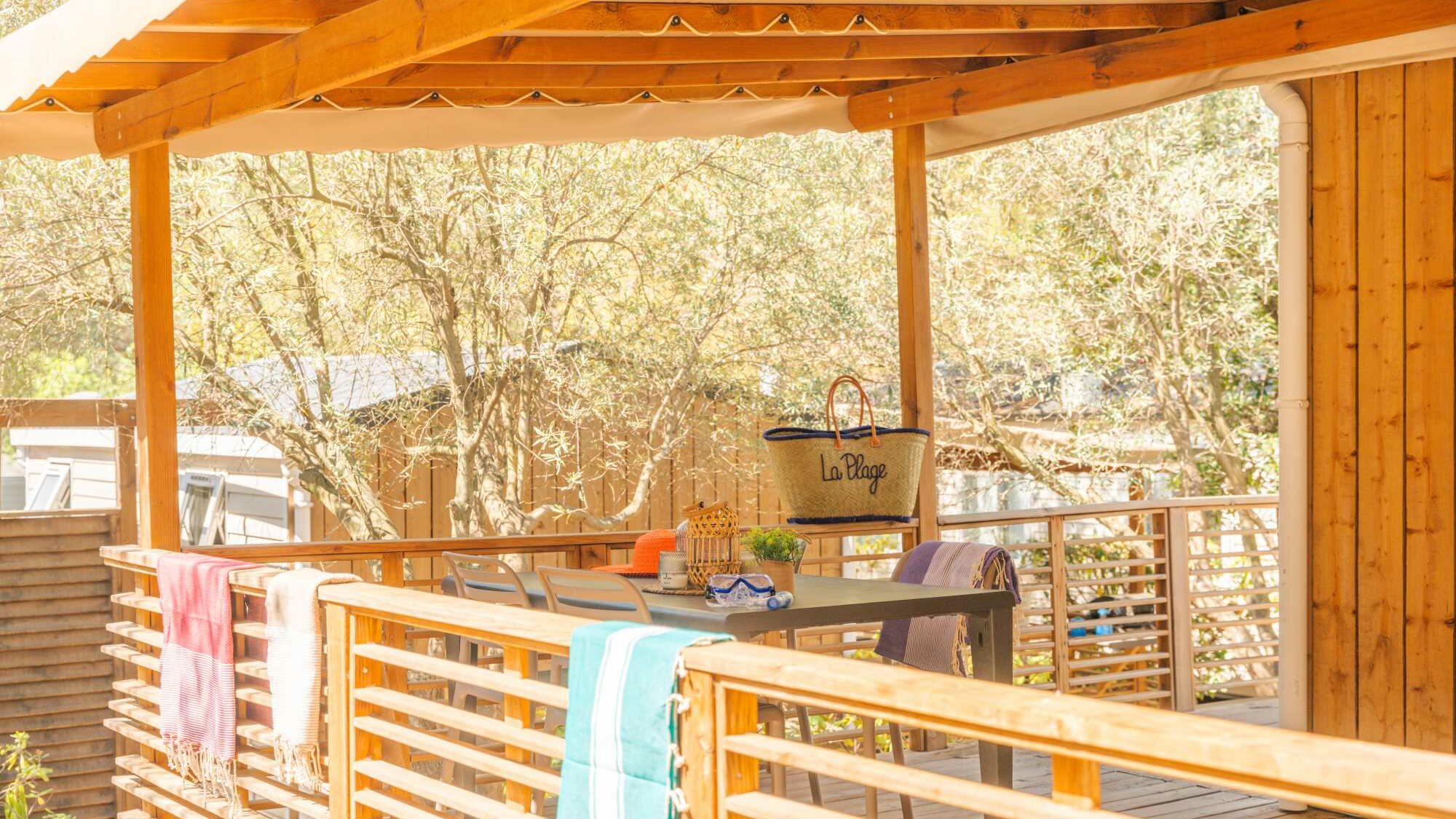 20m² + 15m² Covered terrace. One double bedroom (bed 160 x 200). A dining area convertible into bed for 2 people (130 x 190). A fully-fitted kitchen. A bathroom with a large shower, sink and toilet. Garden furniture.