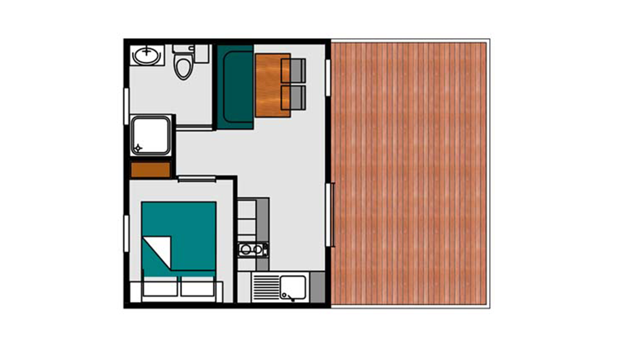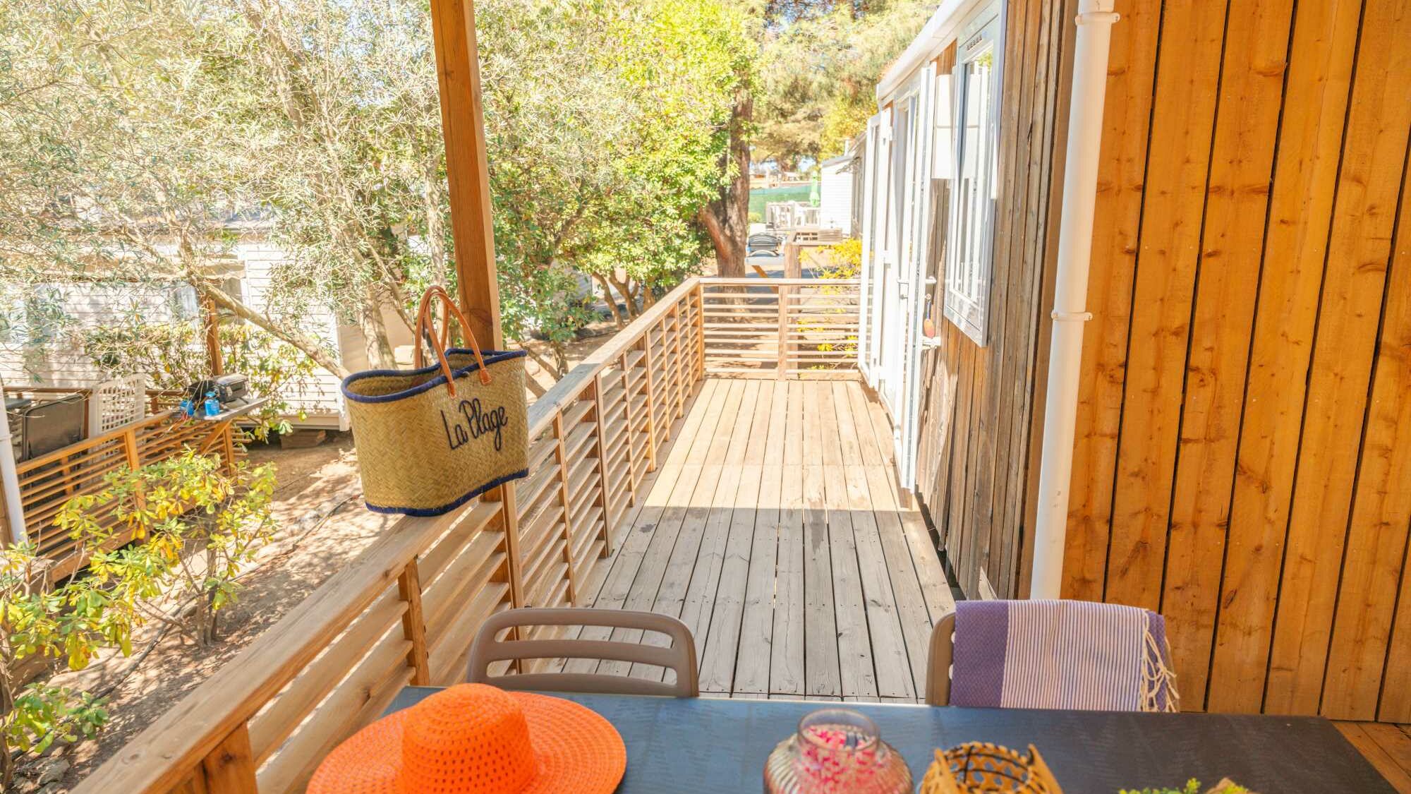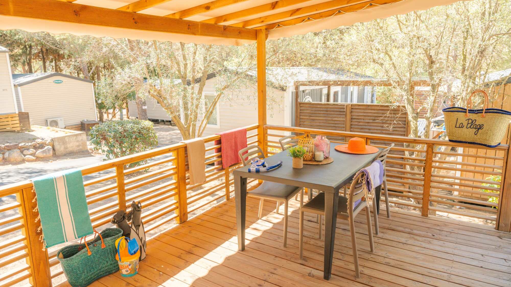 20m² + 15m² Covered terrace. One double bedroom (bed 160 x 200). A dining area convertible into bed for 2 people (130 x 190). A fully-fitted kitchen. A bathroom with a large shower, sink and toilet. Garden furniture.