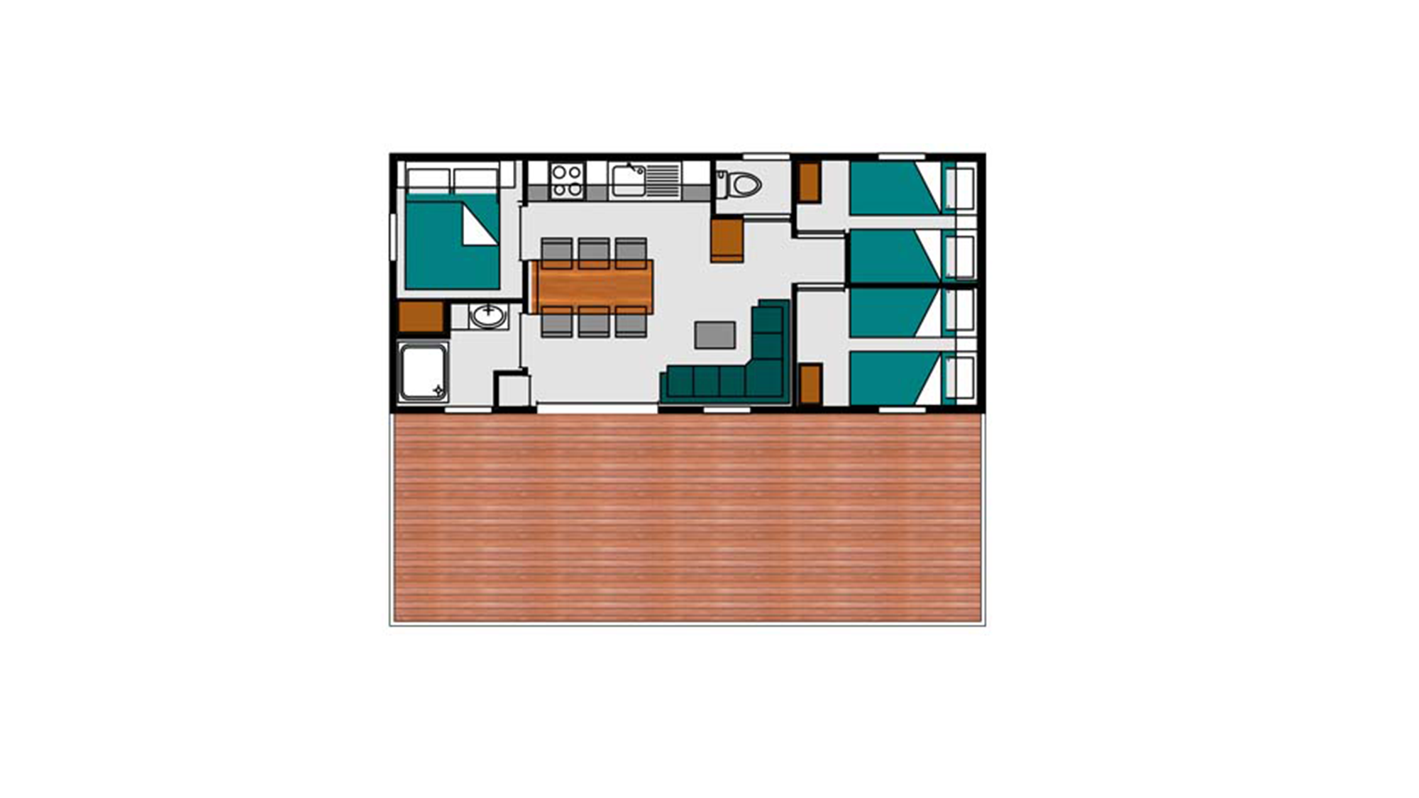 34 m² + 20 m² Of covered terrace, one double bedroom (bed 160 x 200), two bedrooms with 2 single beds (80 x 190), living area, large fully-fitted kitchen with central island, bathroom with an XXL shower (100 x 80) and sink, 1 separated toilet. Garden furniture.