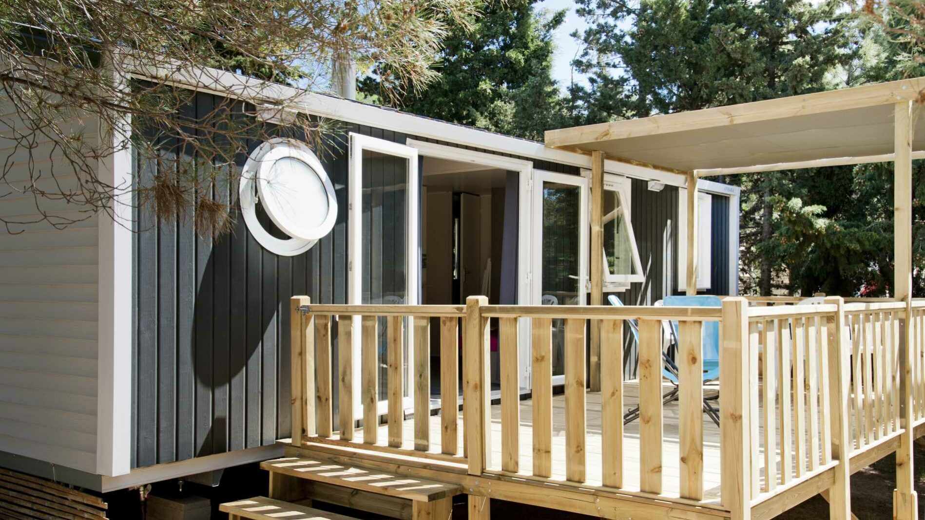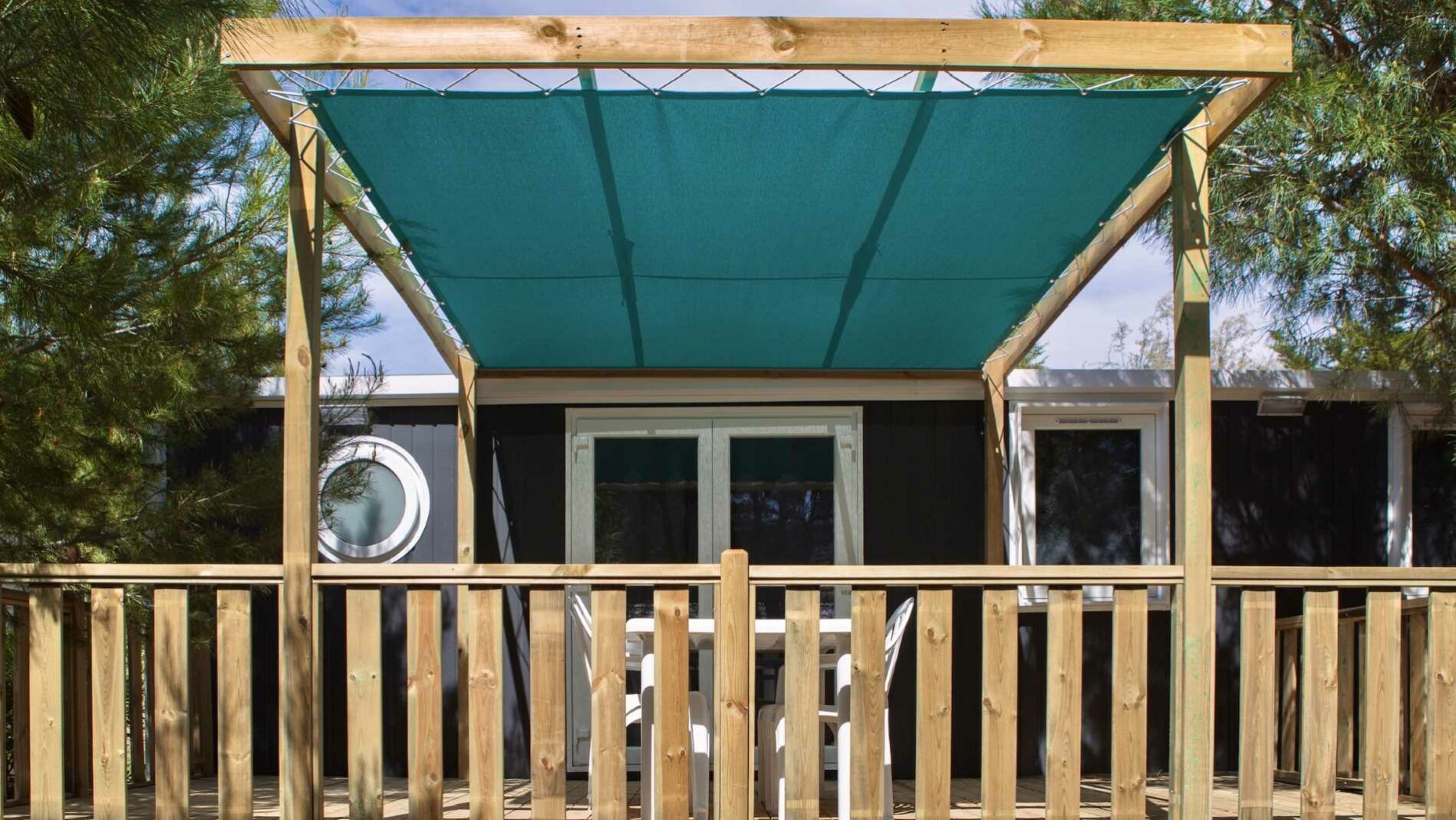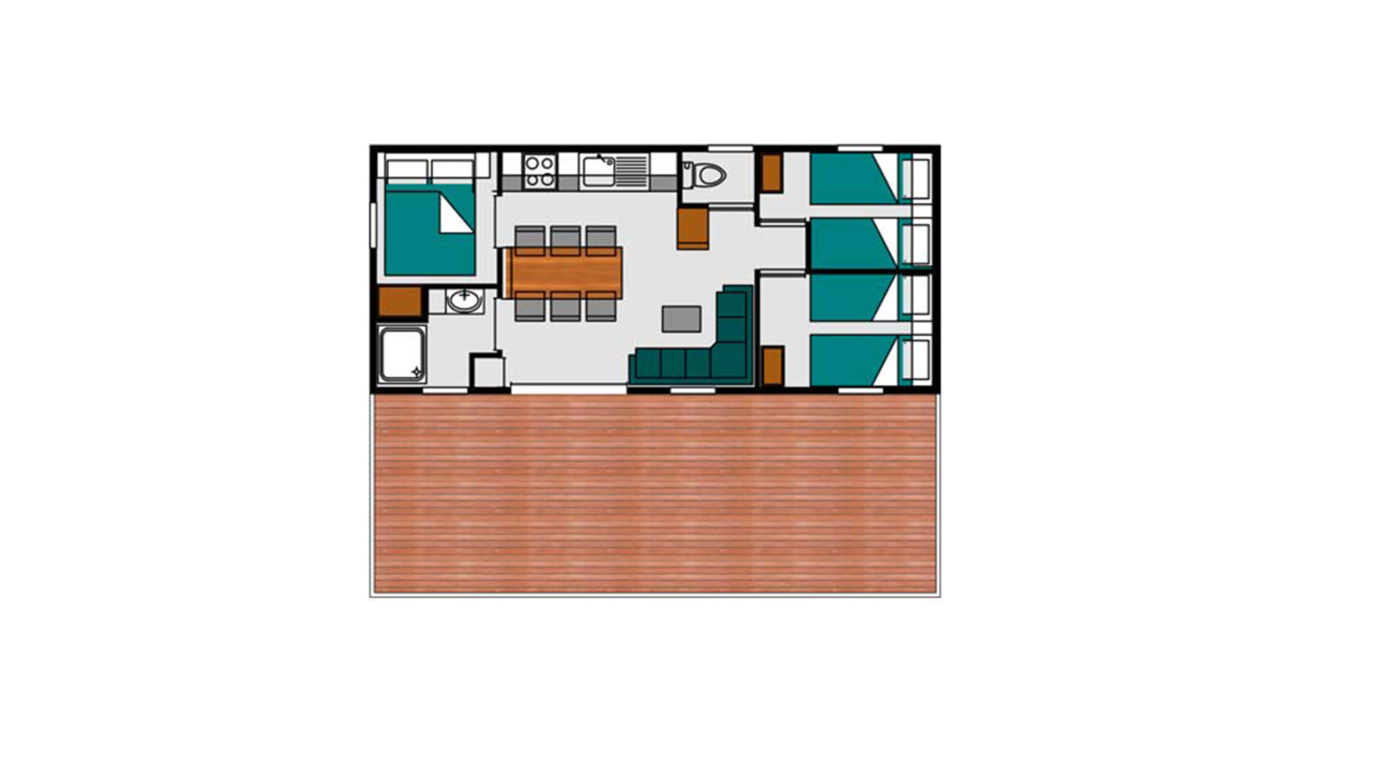 34 m² + 20 m² Of covered terrace, one double bedroom (bed 160 x 200), two bedrooms with 2 single beds (80 x 190), living area, large fully-fitted kitchen with central island, bathroom with an XXL shower (100 x 80) and sink, 1 separated toilet. Garden furniture.