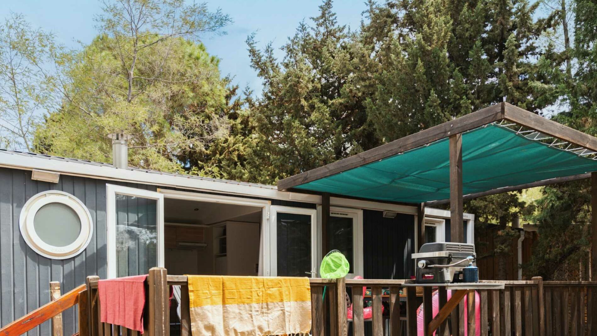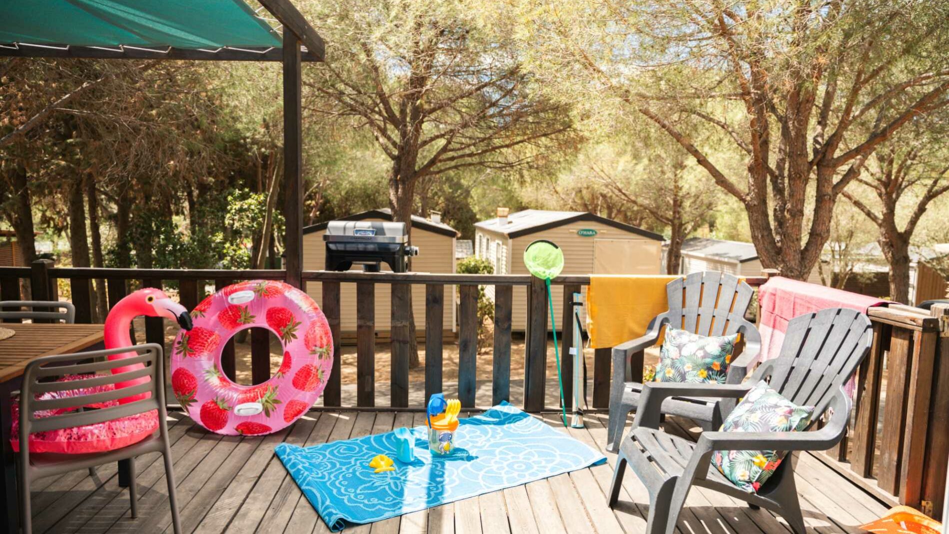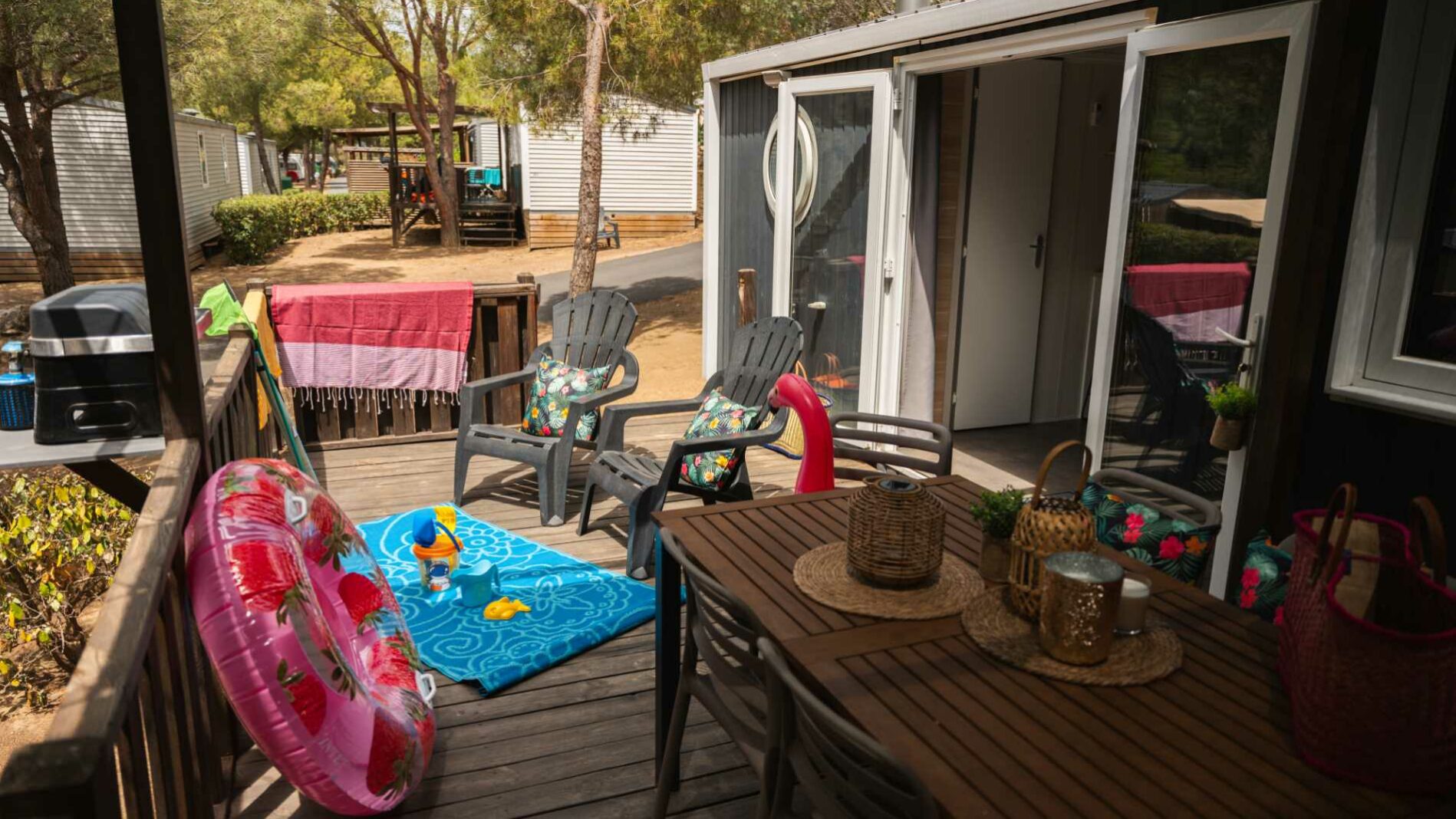 34 m² + 20 m² Of covered terrace, one double bedroom (bed 160 x 200), two bedrooms with 2 single beds (80 x 190), living area, large fully-fitted kitchen with central island, bathroom with an XXL shower (100 x 80) and sink, 1 separated toilet. Garden furniture.