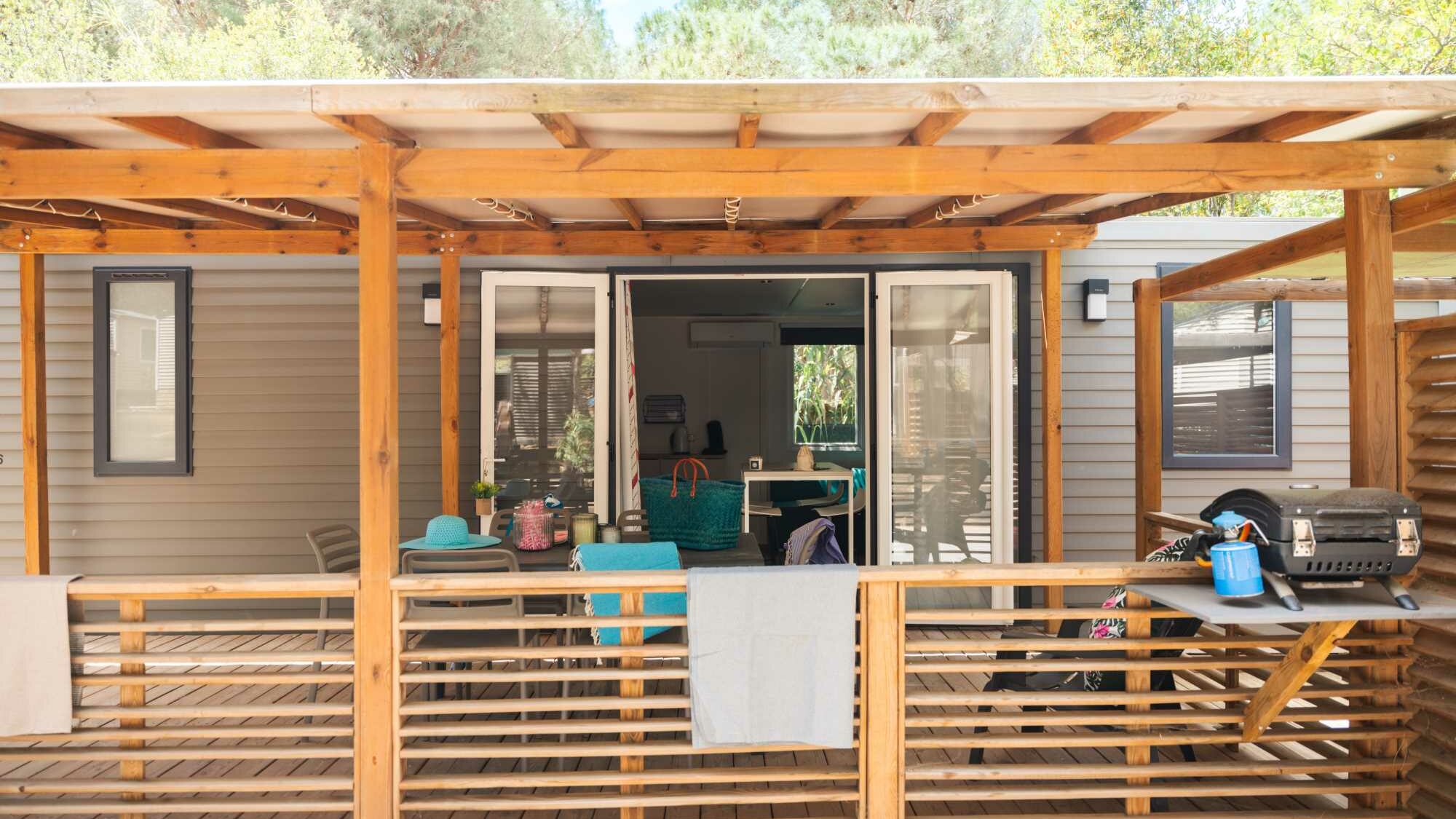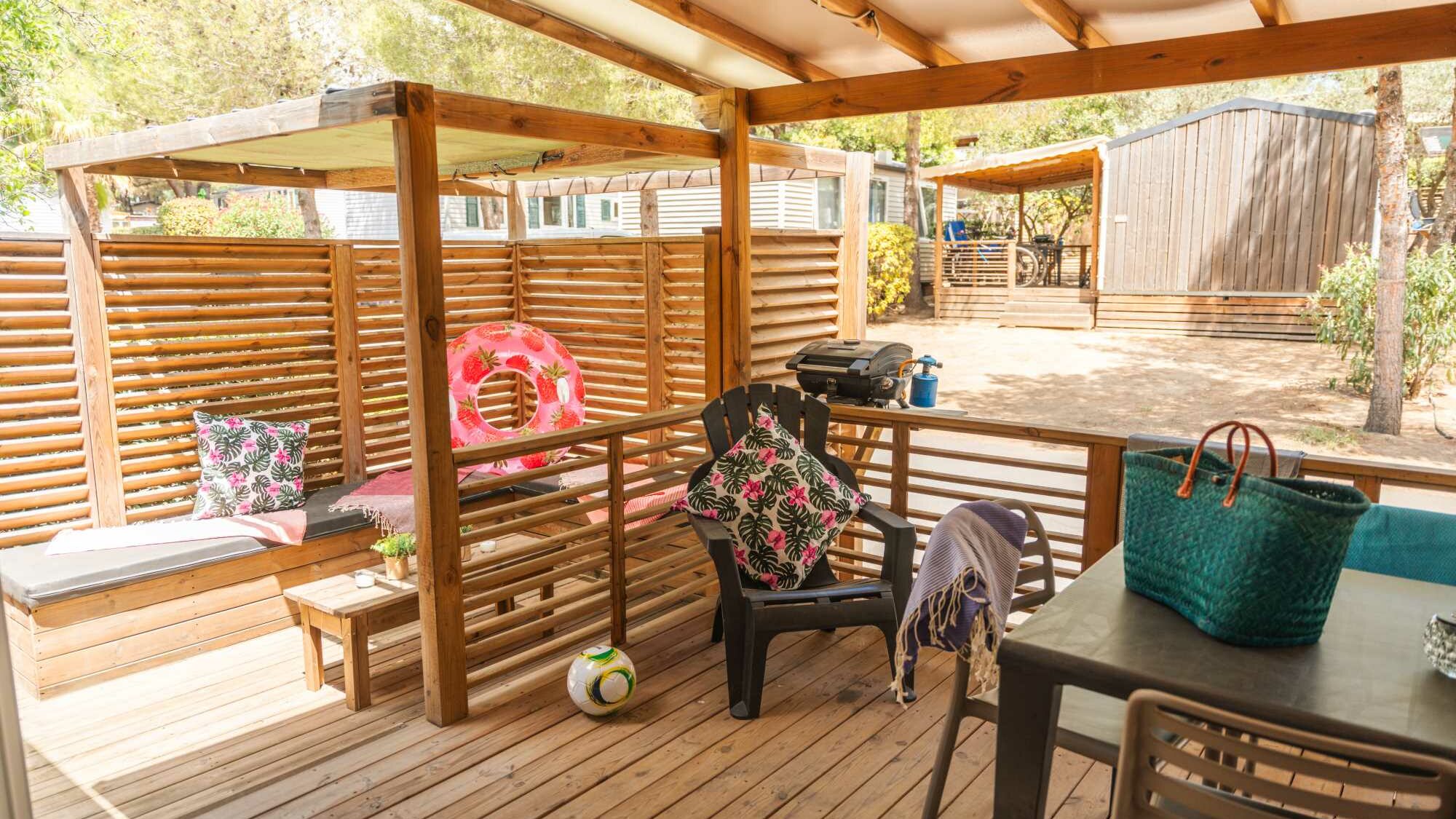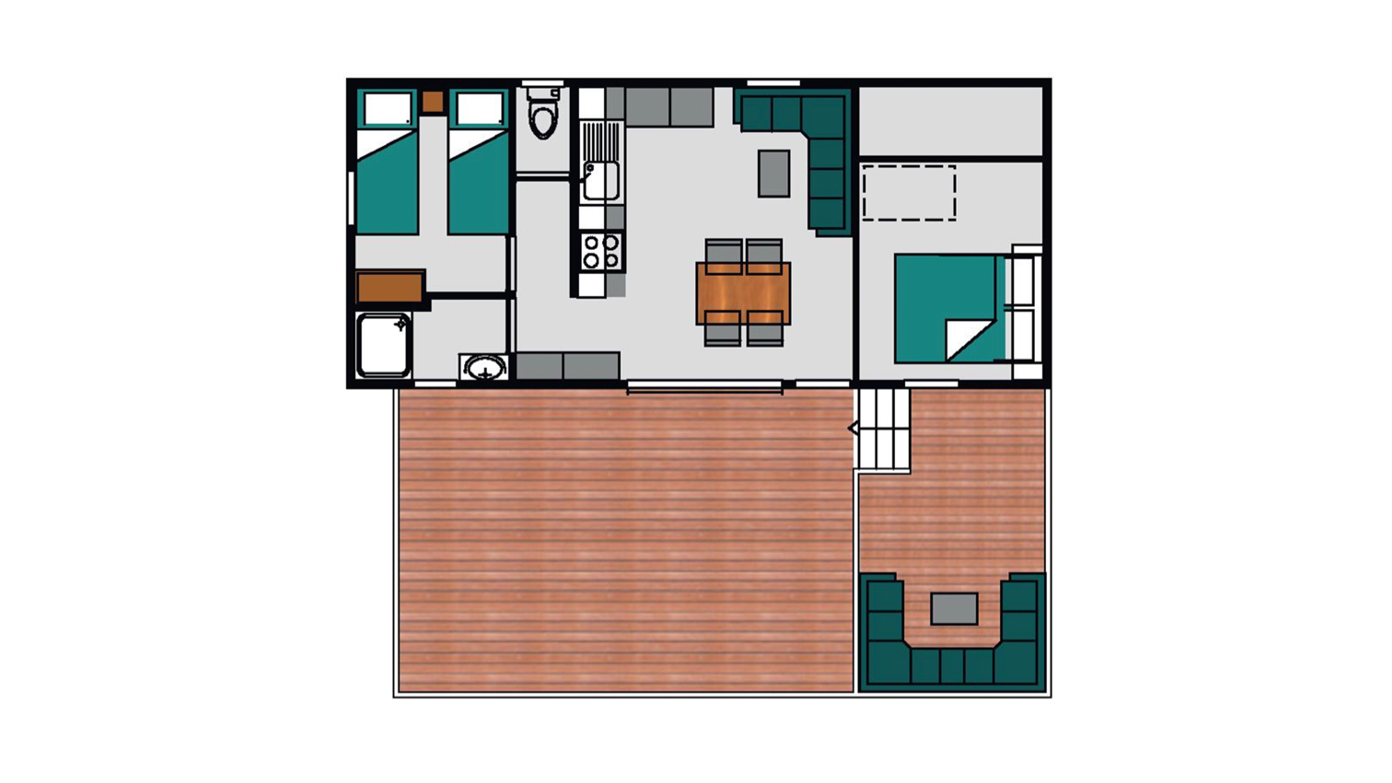 36m² + 30m² Wooden terrace on two levels, partially covered. One bedroom with 1 double bed (160 x 200), one bedroom with 2 single beds (80 x 190), A dining area convertible into bed for 2 people (140 x 190), large fully-fitted open-plan kitchen. A bathroom with shower, sink and separated toilet. Garden furniture and outdoor lounge area.