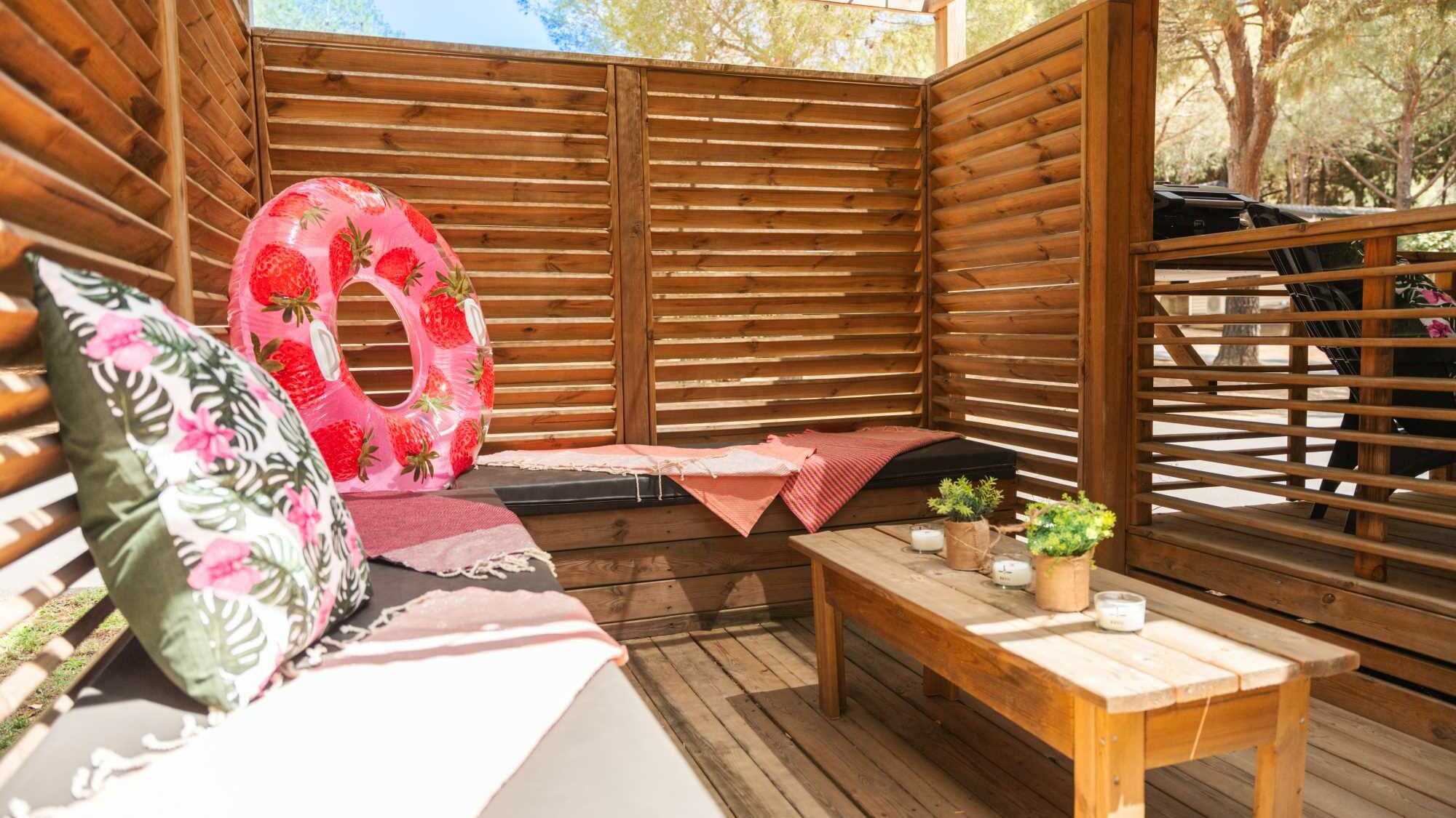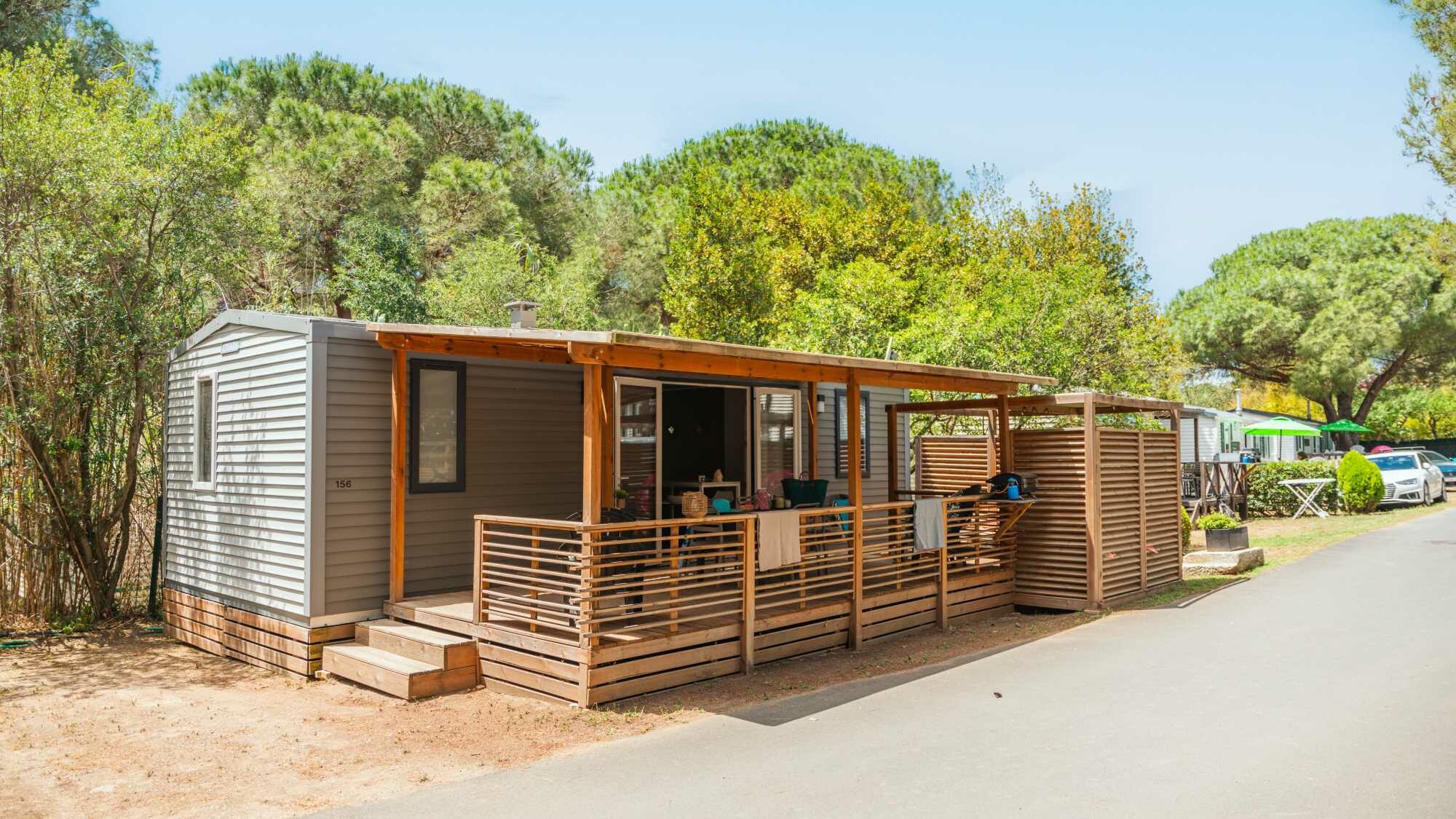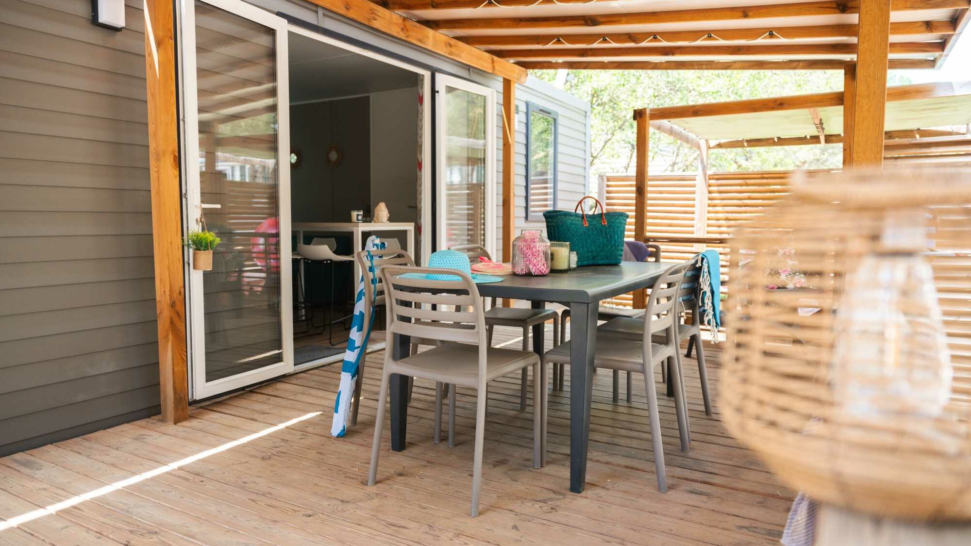 36m² + 30m² Wooden terrace on two levels, partially covered. One bedroom with 1 double bed (160 x 200), one bedroom with 2 single beds (80 x 190), A dining area convertible into bed for 2 people (140 x 190), large fully-fitted open-plan kitchen. A bathroom with shower, sink and separated toilet. Garden furniture and outdoor lounge area.